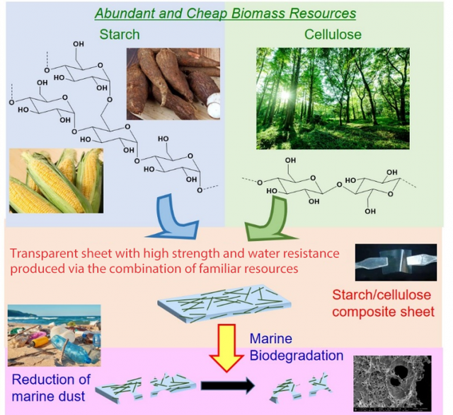Jednak zespół kierowany przez profesora Taka-Aki Asoha z Uniwersytetu w Osace i profesora Hiroshi Uyama opracował inny rodzaj przezroczystego plastiku, którego głównymi składnikami są nanowłókna celulozowe i skrobia, oba pochodzące z roślin. Dzięki zastrzeżonemu procesowi produkcyjnemu udowodniono, że produkt końcowy ma doskonałą wodoodporność i wysoką wytrzymałość, a także ma wysoką biodegradowalność, gdy długo pływa w wodzie morskiej.